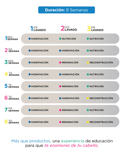 El cronograma capilar es un plan de cuidado diseñado para transformar tu melena en 8 semanas. A través de un enfoque equilibrado que combina rutinas de hidratación, nutrición, reconstrucción y reparación, podrás disfrutar de un cabello más brillante, fuerte y saludable en poco tiempo.